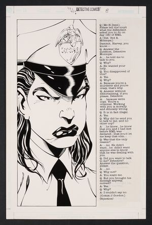 Original Art from Detective Comics #739 (1999) Page 8 Pencils by Damion Scott, Inks by John Floyd 1999 DC As chaos reigns on the streets of Gotham during No Man's Land, Two-Face's "trial" of Jim Gordon continues as Renee takes the witness stand. The court transcript format of this page works well, giving Scott and Floyd a chance to shine with the large closeup of Montoya. Pencil and ink with text stat on DC Comics art board. 11 1/4" X 17". |