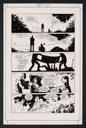 Original Art from Manifest Destiny #20 (2016) Page 1 Inks by Tony Akins, Printed Pencils by Matthew Roberts 2016 Image A terrifying take on the legendary journey of Lewis and Clark, the expedition has been waylaid by rough weather and a lack of food- which has turned the men to cannibalism. As the situation gets even more tense, Lewis and Clark discover a skull in the fireplace of a derelict cabin...a cyclops skull! Signed by Akins in lower left. Ink over printed pencils on art board. 11" X 17". |