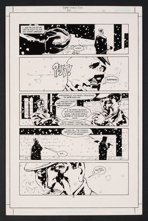 Original Art from Archard's Agents The Case of the Puzzled Pugilist (2003) Pg 14 Pencils and Inks by Mike Perkins from Archard's Agents (2003 One-Shot) The Case of the Puzzled Pugilist 1 2003 CrossGen Comics On the run from some unsavory folks, bareknuckle boxer Peter Grimes takes refuge as a hired hand at a country estate- but is high society even more dangerous than organized crime? Signed by Perkins in lower right. Pencil and ink on Crossgen comic art board. 11" x 17". |