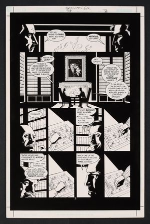 Original Art from Batman Gotham Knights #38 (2003) Page 3 Pencils by Roger Robinson, Inks by John Floyd 2003 DC Surprising both Alfred and the reader, Bruce Wayne has decided to have a quiet evening at home with his trusty butler playing chess. Of course, as in most fiction chess isn't just chess as Alfred makes the true opening move and asks Bruce which of the 'kids' he wants to talk about first. Pencil and ink on DC Comics art board. 11 1/4" X 17". |