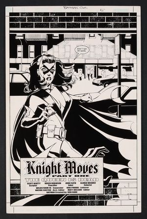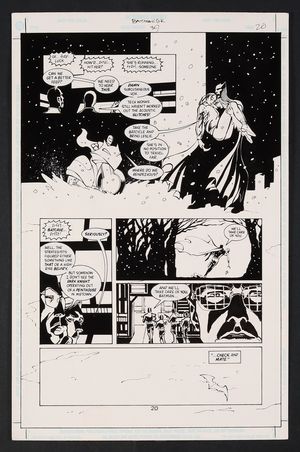 Original Art from Batman Gotham Knights #39 (2003) Page 20 Pencils by Roger Robinson, Inks by John Floyd 2003 DC A striking, beautiful page that sees Batman and Robin (Tim Drake) rescuing a drugged and discombobulated Huntress who's just escaped from a Checkmate facility. What our heroes don't know however is that this was all part of Checkmate's plan and they're currently mobilizing to track down the Dark Knight! Pencil and ink on DC Comics art board. 11 1/4" X 17". |