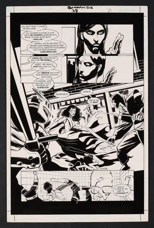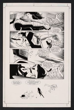 Original Art from Batman Gotham Knights #38 (2003) Page 7 Pencils by Roger Robinson, Inks by John Floyd 2003 DC Huntress's drug induced psychosis while under observation by Checkmate continues as visions of Prometheus and Omerta appear to attack her while the unseen voices continue to observe her from behind the glass. Pencil and ink on DC Comics art board. 11 1/4" X 17". |