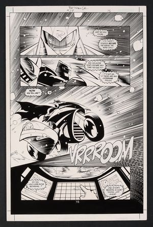 Original Art from Batman Gotham Knights #39 (2003) Page 15 Pencils by Roger Robinson, Inks by John Floyd 2003 DC As a great man once said, "Where does he get those wonderful toys?" A great page that showcases Batman's sleek Batcycle as the Caped Crusader and Boy Wonder (Tim Drake) speed through the city to track down a wayward Batarang. Pencil and ink on DC Comics art board. 11 1/4" X 17". |