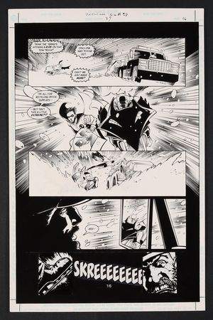 Original Art from Blaze # 7 (1995) Page 7 Pencils by Henry Martinez, Inks by Bud Larosa from Blaze (1994) 7 1995 Marvel If Johnny Blaze thought being free of the Spirit of Vengeance would mean a nice quiet life, he was sorely mistaken! After rejecting the talents of trick-shooter Double Tap for the Quentin Carnival, Johnny's stunt performance is violently interrupted by the shootist in this action packed page! Also includes a copy of the original issue. Pencil and ink on Marvel Comics art board. 11 1/4" x 17 1/4", B&W. |