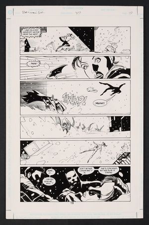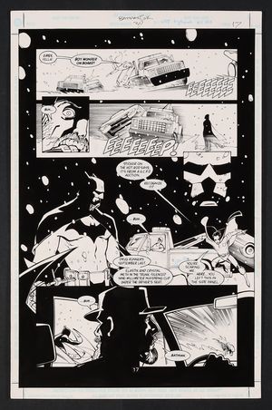 Original Art from Batman Gotham Knights #39 (2003) Page 19 Pencils by Roger Robinson, Inks by John Floyd 2003 DC While Batman and Robin are spending their evening using GPS tracking to hunt down wayward Batarangs, Helena Bertinelli aka Huntress is on the run after escaping from a Checkmate facility and here they collide in spectacular fashion. Insurance is gonna have a heck of a time sorting this one out. Pencil and ink on DC Comics art board. 11 1/4" X 17". |