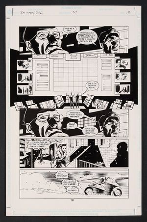 Original Art from Batman Gotham Knights #9 (2000) Page 19 Pencils by Roger Robinson, Inks by John Floyd from Batman Gotham Knights (2000) 9 2000 DC In the aftermath of an explosion that's seemingly killed Batman, Dick Grayson makes use of his acrobatics skills to get past emergency services- while Tim tries to maintain a modicum of opsec. Pencil and ink on DC Comics art board. 11 1/4" x 17". |