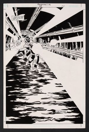 Original Art from Batman Gotham Knights #39 (2003) Page 22 Pencils by Roger Robinson, Inks by John Floyd 2003 DC A fantastic cliffhanger splash as Checkmate has finally tracked down the Dark Knight thanks to a tracking device inserted into Huntress when she was in their custody. Robinson and Beatty make great use of negative space here, cutting through the murk of the sewer tunnel that leads to the Batcave with large blank areas depicting the harsh glow of the Checkmate operatives' tactical flashlights. Pencil and ink on DC Comics art board. 11 1/4" X 17". |