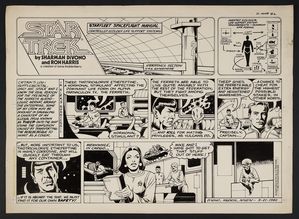 Original Art for the Star Trek Comic Strip (3/21/1982) by Ron Harris 1982 A wonderful Sunday entry of the short-lived (and little known!) Star Trek comic strip with everything a Trekkie could ask for- a nicely designed technical panel, beautifully drawn closeup panels of Spock and Kirk, a lively scene in the cargo bay, and an ominous tease of the Ferreth Starfleet officer Mernat. Pencil and ink on art board. 24 1/4" x 17 1/2". |