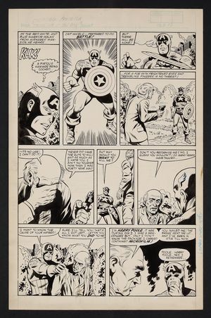 Original Art Unpublished Captain America Story (c. 1970's) Page 13 Pencils and Inks by Jack Abel 1970s An emotional moment from this inventory story finds Cap confronted with his World War 2 past by a man who was unwittingly caught up in an espionage plot and imprisoned for decades because of it. Not only do we get a nice hero shot of Cap in panel two, we get to see Cap's true power as he immediately displays empathy towards the man. Pencil and ink on Marvel Comics art board. 11" x 17". |