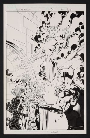 Original Art from Avengers Academy #11 (2011) Page 3 Pencils by Tom Raney, Inks by Scott Hanna from Avengers Academy (2010) 11 2011 Marvel A magnificent splash that also serves as the title page for this issue showcasing the return of one of the Avengers' most dangerous foes- Korvac! In an attempt to bring Janet Van Dyne back to life, Avengers Academy student Veil has instead revived Carina Tivan, Michael Korvac's wife (and daughter of The Collector!), which has of course attracted Korvac's attention. Raney and Hanna inject a ton of power into this page with Korvac's form dissipating into massive clouds of energy- dotted with some Kirby Krackle! Signed by Raney in lower margin. Pencil and ink on Marvel Comics art board. 11" x 17 1/4". |