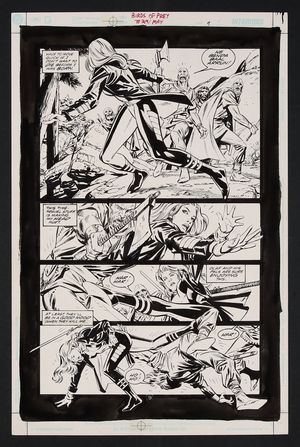 Original Art from Birds of Prey #29 (2001) Page 9 Pencils and Inks by Butch Guice from Birds of Prey (1999 1st Series) 29 2001 DC Black Canary takes on a band of Vikings in this frenetic fight page from the great Butch Guice! Time travel shenanigans abound when STAR Labs discovers an ancient tablet engraved with Dinah's image and shanghaies her into a mission to the past to find out what's going on. Guice does a beautiful job here with subtle panel breaks that give the page a ton of energy. Pencil and ink on DC Comics art board. 11 1/4" x 17". |