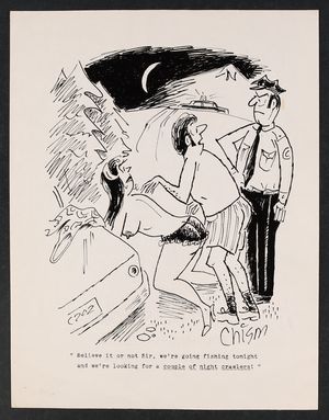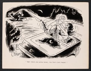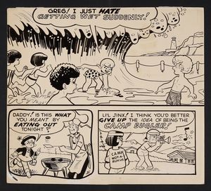 The Fun's Just Begun Gag Strip by Jack Chism 1970s Chism was a prolific cartoonist, contributing mainly to Charlton's compilations including Good Humor and Cartoon Carnival. Signed by the artist. Pencil and ink on paper with a custom stamp from Chism on the reverse. 8 1/2" x 11" |