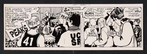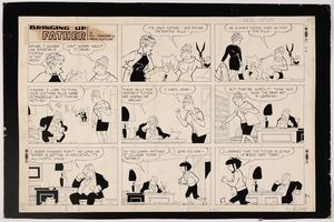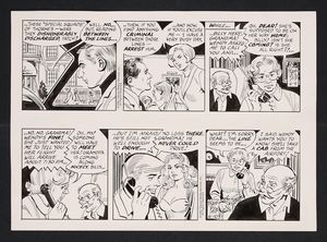Original Art for the Bringing Up Father Comic Strip (4/5/1970) by Frank Fletcher In auction ending January 14 1970 Pencil and ink on art board which has been affixed to a sheet of heavy board with glue on the reverse. Art measures 22 1/2" x 15", heavy board measures 16 1/2" x 25". NOTE: Heavy board displays some moisture damage on the reverse, which does not appear to have affected the art board that the strip is drawn on. |