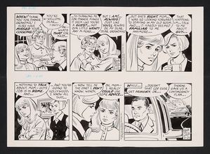 Original Art from Betty & Veronica #23 (1989) Page 29 Pencils by Dan DeCarlo, Inks by Jim DeCarlo from Betty and Veronica (1987 1st Series Archie) 23 1989 Archie Publications Veronica is furious after calling Archie and getting his answering machine (she refuses to talk to machines), Betty comes up with an absolute ingenious solution to the problem! Pencil and ink on Archie Comics art board. 11 1/2" x 17 1/2". |