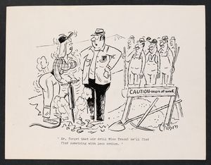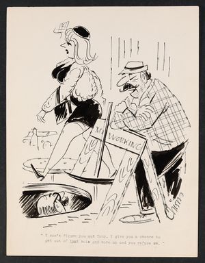 Small Potatoes Gag Cartoon by Scott Shadburne Pre1950 Likely published in a local Springfield, Missouri newspaper as Shadburne was employed by Springfield Newspapers Inc. until his death in 1953. Signed by the artist. Pencil and ink on art board. 8 1/2" x 11 1/2". |