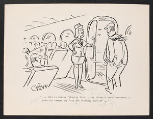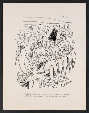 The Friendly Skies Gag Strip by Jack Chism 1970s Chism was a prolific cartoonist, contributing mainly to Charlton's compilations including Good Humor and Cartoon Carnival. Signed by the artist. Pencil and ink on paper with a custom stamp from Chism on the reverse. 8 1/2" x 11" |