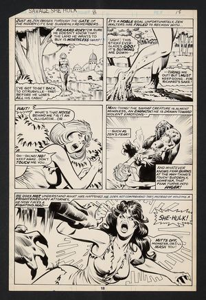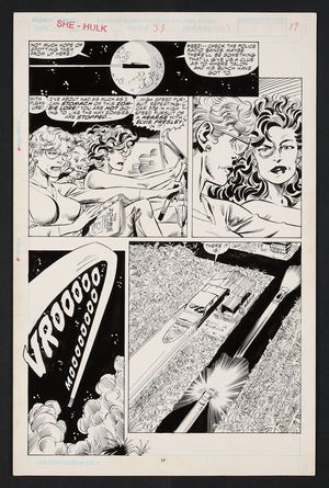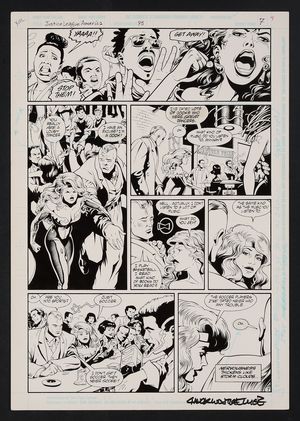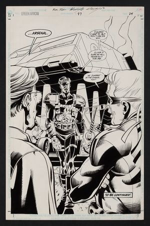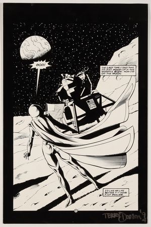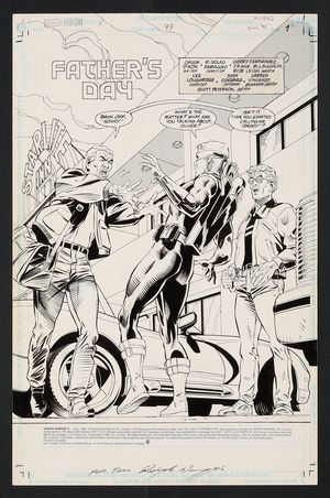 Original Art from Flash #25 (1989) Page 20 Pencils by Greg LaRocque, Inks by Larry Mahlstedt 1989 DC Road trips can be stressful enough, even without the pressure of trying to track down an out-of-control Flash before he dies or causes a disaster! Tempers flare on this page as Tina, Mason, and Jerry (formerly the Speed Demon!) decide to call it a night. Pencil and ink on DC comics art board. 11" X 16 3/8". |