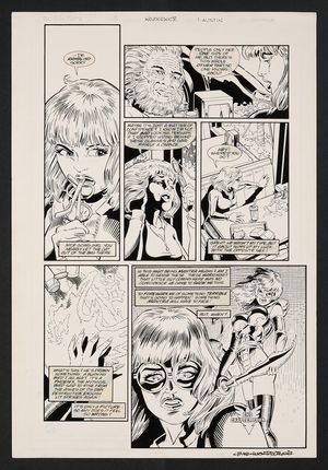 Original Art from Artemis Requiem #2 (1996) Page 8 Pencils by Ed Benes, Inks by Doug Selogy from Artemis Requiem (1996) 2 1996 DC An ominous page that brings to mind the horror mags of the 70's! Artemis has only just brushed the dirt off after rising from the grave and finds herself in the midst of a satanic nazi cult's human sacrifice ritual! Pencil and ink on DC Comics art board. 11 1/2" x 16 1/2". |