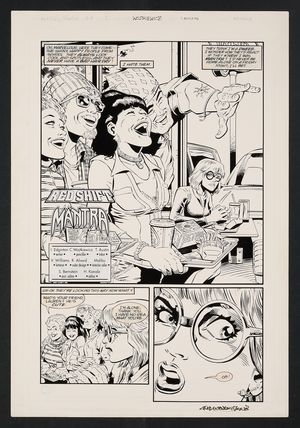 Original Art from Deadpool #17 (1998) Page 17 Pencils by Walter McDaniel, Inks by John Livesay from Deadpool (1997 1st Series) 17 1998 Marvel Is Deadpool the prophesied intergalactic messiah known as the Mithras said to bring about a universal utopia? A group of employees from the intergalactic holding company Landau, Luckman, and Lake seem to think so, even if the Merc With a Mouth doesn't! We get a beautiful central image of Deadpool aiming his gun at Zoe Culloden on this page which is hilariously undercut just below. Signed by McDaniel at top of page. Pencil and ink on Marvel Comics art board. 11" x 17 1/4". |