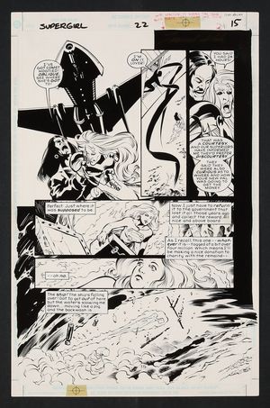 Original Art from Adventures in the DC Universe #11 (1998) Page 15 Pencils by John Delaney, Inks by Ron Boyd from Adventures in the DC Universe (1997) 11 1998 DC Trapped in a dimension of nightmares without his ring, Kyle Rayner is in need of a rescue- thankfully a lack of superpowers doesn't phase Wonder Woman as she stages a jailbreak in this action heavy page. Pencil and ink on DC Comics art board. 11 1/2" x 16 1/2". |