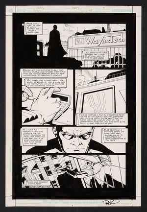 Original Art from Batman Gotham Knights #38 (2003) Page 2 Pencils by Roger Robinson, Inks by John Floyd 2003 DC Something is amiss at Wayne Manor! It appears that Bruce Wayne is...playing around and having fun? It's a quiet night in Gotham so Bruce has apparently decided to stay in and spend some time with his oldest friend, though Alfred has some doubts. Pencil and ink on DC Comics art board. 11 1/4" X 17". |