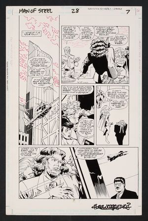 Original Art from Adventures in the DC Universe #18 (1998) Page 5 Pencils by John Delaney, Inks by Ron Boyd from Adventures in the DC Universe (1997) 18 1997 DC A fantastic half splash of Amazo carving out a message in the middle of Metropolis Park with a Lantern construct opens this page with Green Lantern watching from the satellite and delivering a classic Looney Tunes line. Pencil and ink on DC Comics art board. 11" x 17". |