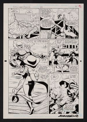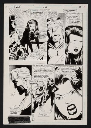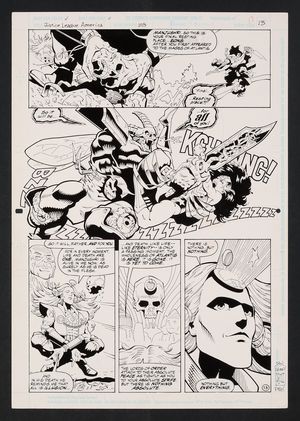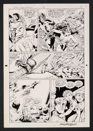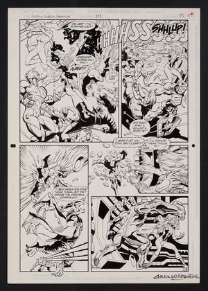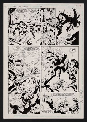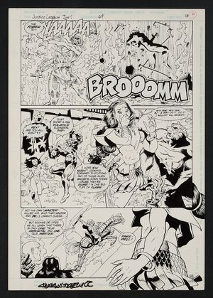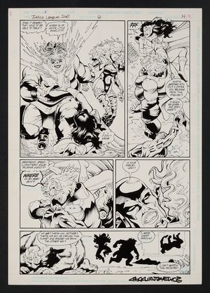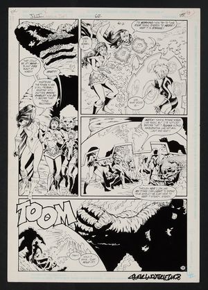 Original Art from Adventures in the DC Universe #11 (1998) Page 16 Pencils by John Delaney, Inks by Ron Boyd from Adventures in the DC Universe (1997) 11 1998 DC A beautifully drawn full-length panel of Toxxis, the ruler of The Pit of Despair, is the centerpiece of this page that sees the de-powered Wonder Woman and Green Lantern fight for lives against an army of henchmen. Pencil and ink on DC Comics art board. 11 1/2" x 16 1/2". |