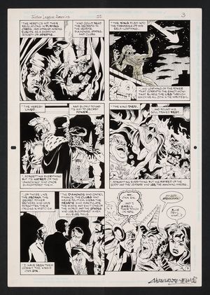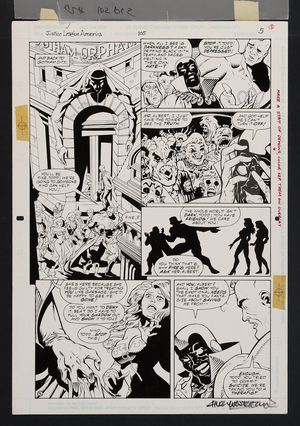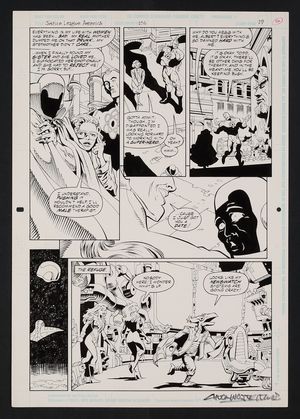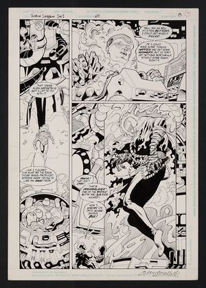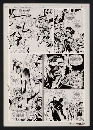 Original Art from Justice League of America #244 (1985) Page 10 Pencils by Joe Staton, Inks by Mike Machlan 1985 DC In this crossover, the Justice League is on the run from Infinity Inc.! After the beating they took last issue Martian Manhunter makes the executive decision that the team of Vibe, Zatana, Elongated man, Gypsy, and himself are not going to be enough and decides to look out of universe in search of aid. A great example of the fun dynamic this fan-favorite JLA lineup had! Signed by Joe Staton in the lower middle margin. Pencil and ink on SC comics art board. 11" X 16 1/4". |