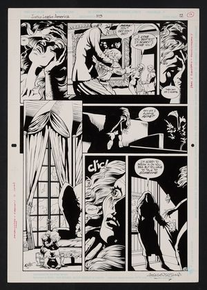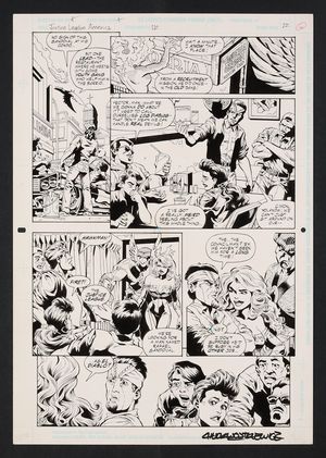 Original Art from Adventures in the DC Universe #9 (1997) Page 22 Pencils by John Delaney, Inks by Ron Boyd from Adventures in the DC Universe (1997) 9 1997 DC A dramatic and somewhat gruesome final page caps off Morrie's short-lived life of crime (this is his only appearance!) with a THOP! Canary uses the villain's talent for remembering everything he's ever seen or heard against him, depicted marvelously in the first panel with a dizzying array of memories and information filling his mind. Pencil and ink on DC Comics art board. 11" x 17". |