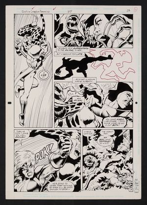 Original Art from Adventures in the DC Universe #19 (1998) Page 18 Pencils by John Delaney, Inks by Ron Boyd from Adventures in the DC Universe (1997) 19 1998 DC Double crossed by her ancient god-powered employer after stealing Wonder Woman's lasso, Catwoman proves she's not JUST a callous thief by showing up to save Diana's life and help fight the monster. A fun action page with the feline felon wielding the lasso and showing off her acrobatic skills! Pencil and ink on DC Comics art board. 11 1/2" x 17". |