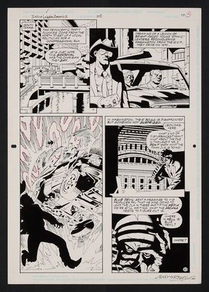 Original Art from Captain Atom #6 (1987) Page 1 Pencils by Pat Broderick, Inks by Bob Smith from Captain Atom (1987 DC) 6 1987 DC An ominous opening to this issue- who is the mysterious man with the long coat and bad aura? Could he be one of THOSE types? Well, fortunately (or unfortunately) it's not a flasher- it's Dr. Spectro! Pencil and ink on DC Comics art board. 11" x 16 1/2". |