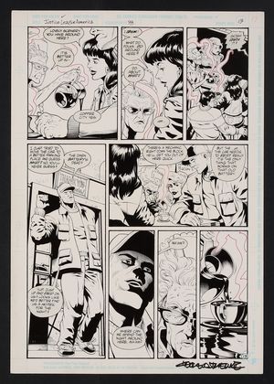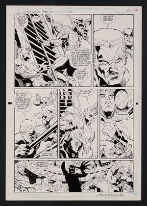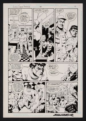 Original Art from Captain America #9 (1997), Page 18 by Joe Bennett, inks by Mark McKenna from Captain America (1996 2nd Series) 9 1997 Original Art from Captain America #9 (1997) page 18 by Joe Bennett, inks by Mark McKenna. This action-packed page from Cap's Heroes Reborn era sees the Star-Spangled hero taking down members of the Sons of the Serpent in almost every large panel! Pencil and ink on Image Comics art board. 11" x 17", B&W. Note: The issue credits Sandra Hope and Homage Studios with inks for this issue, but this page is signed by Mark McKenna. Also includes a copy of the original issue. |