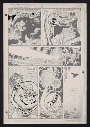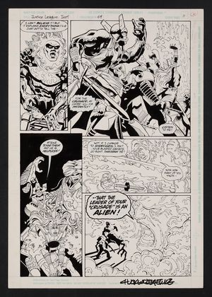 Original Art from Flash #21 (1988) Page 21 Pencils by Greg LaRocque, Inks by Larry Mahlstedt 1988 DC A team-up too brave and too bold to miss out on- Flash and Fidel Castro! Sent to Cuba to fight back against the shapeshifting Durlans, Flash encounters Fidel Castro hiding in the jungle and helps the leader expose the Durlan who replaced him- and convinces the others across the country to unmask in the process. A great final panel caps off this page as the dúo dinámico watch the people rise up and fight back against the alien invaders. Pencil and ink on DC comics art board. 11" X 16". |