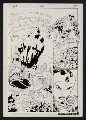 Original Art from Flash #71 (1992) Page 21 Pencils by Greg LaRocque, Inks by Roy Richardson 1992 DC The Flash's confrontation with The Alchemist, a new villain using Dr. Alchemy's Philosopher stone comes to head on this thrilling page! Thanks to his previous run-ins with Dr. Alchemy, Flash thinks he has everything under control...better hope the Alchemist doesn't have any tricks up his robe! Signed by Mark Waid and Roy Richardson in lower margin. Pencil and Ink on DC comics art board. 11 1/2" X 16 1/2". |