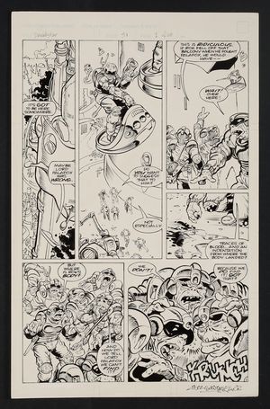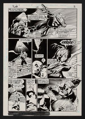 Original Art from Flash #6 (1987) Page 19 Pencils by Butch Guice, Inks by Larry Mahlstedt 1987 DC As Flash confronts Dr. Bortz, Speed Demon makes his move and pins the scarlet speedster under a pane of unbreakable glass. Can our hero stop this freaky fast foe or will Speed Demon prove to much for the world's fastest man? Pencil, ink, and screentone on DC comics art board. 10 3/4" X 16 1/4". |
