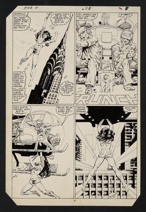 Original Art from Avengers #288 (1988) Page 3 Pencils by John Buscema, Inks by Tom Palmer 1988 Marvel A great half-splash opens this page as we see Kree Sentry 459 (previously defeated by both the FF and Mar-Vell) laying in a field surrounded by junk as some fairly blasé locals hang out around its body. Unfortunately, this bucolic scene which could only take place in the Marvel Universe is disrupted when the Super Adaptoid and Machine Man descend looking to add another metallic member to their group. Pencil and ink on Marvel Comics art board. Pencil and ink on Marvel Comics art board. 11" X 16 1/4". |