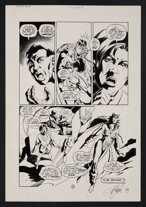 Original Art from Crossgen Chronicles #3 (2001) Page 9 Pencils by George Perez, Inks by Mike Perkins from CrossGen Chronicles (2000) 3 2001 CrossGen Comics A prequel story that deepens the lore of the world of Meridian, this issue tells the story of how Sephie's parents met. This fancifully romantic page sees Ideria realize that her feelings for Turos may mean more than her desire for adventure. Perez and Perkins make a fantastic penciller/inker team! Blue line pencil and ink on Crossgen comic art board. 11" x 17". |