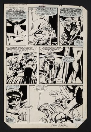 Original Art from Detective Comics #559 (1985) Page 17 Pencils by Gene Colan, Inks by Bob Smith In auction ending January 14 from Detective Comics (1937 1st Series) 559 1985 DC A nice panel page from a solid issue that finds the Dark Knight and the Emerald Archer at philosophical odds while trying to take down a corrupt chemical manufacturer! Some great panels on this page, especially the third featuring Canary in her new costume. Signed by Colan in lower margin. Pencil and ink on comic art board. 10 3/4" x 16 1/4". |