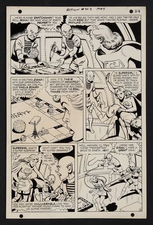 Original Art from Action Comics #363 (1968) Page 24 Pencils and Inks by Kurt Schaffenberger In auction ending January 14 from Action Comics (1938 DC) 363 1968 DC The Maid of Might has her hands...full trying to deal with some extraterrestrial brats in this delightful page by the great Kurt Schaffenberger. When buildings and monuments across the world are mysteriously pulled into the sky, Supergirl leaps in to action only to find that the culprits are a couple of extraterrestrial children playing a game of Monopoly on a massive scale. Some beautiful work by Schaffenberger inking himself here, especially in the angry expression of Supergirl in the third panel. Pencil and ink on art board. 10 3/4" x 16 3/4". |