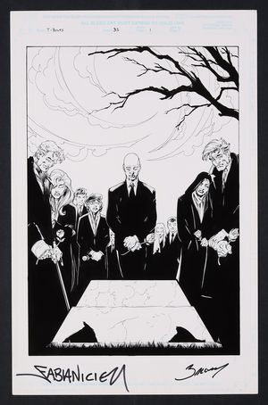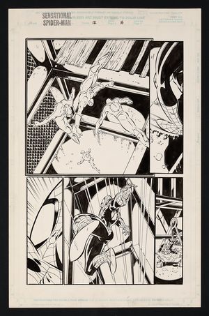Original Art from Batman Gotham Knights #45 (2003) Page 22B Pencils by Roger Robinson, Inks by John Floyd 2003 DC A page that doesn't exist...kind of! The final three pages of this issue were heavily edited down to two with the only surviving parts of this page being panel two and a portion of panel four. This was likely done to bring down the page count, although it's possible editorial was concerned about the security lapse here as Man-Bat and his son Aaron leave the cave with a framed photo of the entire Bat-family out of costume and in the cave! Pencil and ink on DC Comics art board. 11 1/2" X 17". |