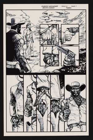 Original Art from Django Unchained #3 (2013) Page 7 Inks by John Floyd, Printed Pencils by Denys Cowan In auction ending July 15 from Django Unchained (2012 DC Vertigo) 3A 2013 DC jango's bounty hunter training progresses as he perfects his draw in this extremely cool page! Also included is a partial page with a redraw of the last panel from the full page. This change was likely done at the behest of editorial and was then scanned and placed over the scan of the full page digitally. Ink over printed pencils on comic art board. Full page measures 11" x 17", partial page measures 4 3/4" x 11". NOTE: Portions of the inks on the full page, mainly solid black areas, are also printed in addition to the pencils. All inks on the partial page are hand inked over printed pencils. |