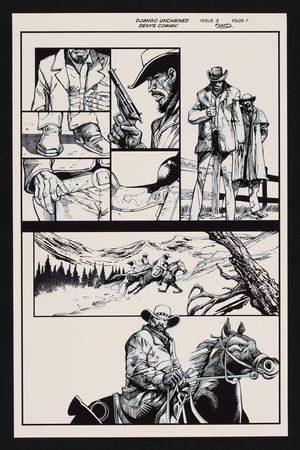 Original Art from Django Unchained #3 (2013) Page 1 Inks by John Floyd, Printed Pencils by Denys Cowan In auction ending July 15 from Django Unchained (2012 DC Vertigo) 3A 2013 DC A tremendous first page that sees Django's partnership with King Schultz begin in earnest as he checks out his new gear and the two head off to take down their next bounty. Everything you could want on a western page! Also included is a partial page with redraws of certain elements and panels from the full page. These changes were likely done at the behest of editorial and were then scanned and placed over the scan of the full page digitally. Ink over printed pencils on comic art board. Full page measures 11" x 17", partial page measures 11" x 7 1/4". NOTE: Portions of the inks on the full page, mainly solid black areas, are also printed in addition to the pencils. All inks on the partial page are hand inked over printed pencils. |