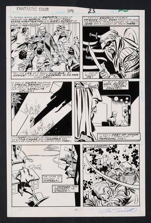 Original Art from Fantastic Four #308 (1987) Page 17 Breakdowns by John Buscema, Finishes by Joe Sinnott from Fantastic Four (1961 1st Series) 308 1987 Marvel A fantastic villain origin page from Big John and Joltin' Joe introduces us to Farouk Al-Fasaud, Oil Minister for the fictional Middle Eastern country of Aqiria whose manipulation of global markets (which made him the richest man in the world) was exposed by reporter Gregory Dunabr. In an attempt to get revenge on Dunbar, Farouk attempts to assassinate him with a blade but misses, striking the satellite uplink equipment and...somehow gaining electronic/digital powers. Well, it looks great, especially the horror-inspired second panel, the noirish third, and the action-packed sixth which is filled to the brim with Kirby Krackle! Signed by Sinnott in lower margin. Pencil and ink on Marvel Comics art board. 11" x 16 1/2". |