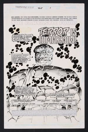 Original Art from Fantastic Four #405 (1995) Page 1 Pencils by Paul Ryan, Inks by Dan Bulanadi from Fantastic Four (1961 1st Series) 405A 1995 Marvel What a title page! An ancient temple in Brazil is found to hold a device which can turn people into Things and after defeating a group of mercenaries looking to use it for their own ends, team Fantastic decide to use it on the injured Ben who fought off a group Thing-ified mercs on his own. Will the machine heal Ben? Could it even restore him to his human form? Find out after a page turn, True Believer! Pencil and ink on Marvel Comics art board. 11" x 17 1/4". NOTE: One caption box ("Revealed At Last" The Sinister Secret of Boris!") is missing from the page. |