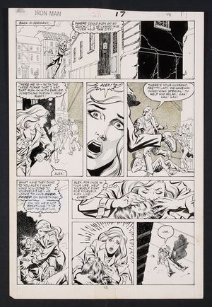 Original Art from Silver Surfer #143 (1998) Page 8 Pencils by Denys Cowan, Inks by John Floyd 1998 Marvel A rare sight in comics- an Alicia Masters action page! One of Marvel's best non-"super" characters, Alicia here finds herself stranded on an alien world and beset by swarms of biomechanical creatures leaving her feeling "like Sigourney Weaver in those 'Alien' films." A dynamic page with some great action panels and a beautiful close shot of Alicia as she finally finds her cyborg companion Cy-phyrr 4. Pencil and ink on Marvel Comics art board. 11" X 17 1/4". |