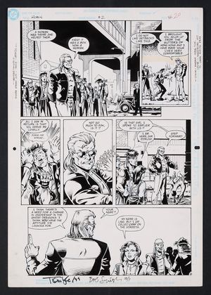 Original Art from Artemis Requiem #2 (1996) Page 8 Pencils by Ed Benes, Inks by Doug Selogy from Artemis Requiem (1996) 2 1996 DC An ominous page that brings to mind the horror mags of the 70's! Artemis has only just brushed the dirt off after rising from the grave and finds herself in the midst of a satanic nazi cult's human sacrifice ritual! Pencil and ink on DC Comics art board. 11 1/2" x 16 1/2". |