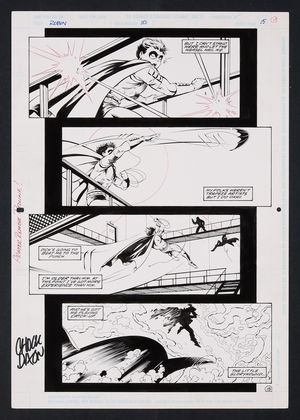 Original Art from Batman Gotham Knights #45 (2000) Page 19 Pencils by Roger Robinson, Inks by John Floyd 2000s In a very emotional scene we see Bruce Wayne begin to break down as he recounts his failings that led to the death of Jason Todd to a social services investigator who's taken an interest in the case. Robinson and Floyd do a great job of capturing the emotional weight of this scene as Bruce doesn't tell any of the usual playboy billionaire cover up stories but instead opens up and gives his honest view on his greatest failure in an eight panel, slow motion breakdown. Pencil and ink on DC Comics art board. 11 1/2" X 17". |