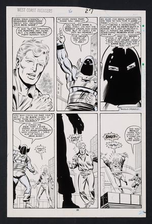 Original Art from West Coast Avengers #16 (1987) Page 20 Pencils by Al Milgrom, Inks by Joe Sinnott from Avengers West Coast (1985) 16 1987 Marvel Hank Pym, the hero formerly known as Ant-Man, Yellowjacket, and Giant Man, faces off with his archnemesis Whirlwind in a battle of...words? In an issue focused on Hank and his rocky history with, well, everything really- superheroics, science, women -the former hero is finally physically confronted with one of his failures here as he finds out that Whirlwind has some emotional issues of his own. This is a great spotlight page for one of the more troubled members of the Avengers and the standoff is depicted wonderfully by Milgrom and Sinnott as they perfectly capture the, um, whirlwind of emotions Hank and his foe are feeling. Pencil and ink on Marvel Comics art board. 10 3/4" x 16 1/2". |
