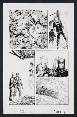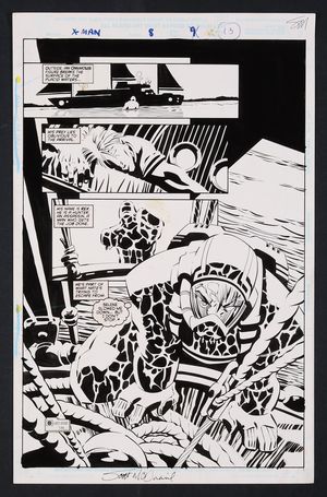 Original Art from Exiles #67 (2005) Page 16 Pencils by Jim Calafiore, Inks by Mark McKenna from Exiles (2001 1st Series Marvel) 67 2005 Marvel The multiverse hopping mutants find themselves in a world plagued by giant monsters, kept at bay only by the Science Squad! Arriving on this earth seeking the aid of its Curt Conners, the team must first help the Science Squad defeat Krakoa, The Island that Walks Like a Man. Hey, those ships look kind of familiar...wonder if they can combine to form a large mech... Signed by Calafiore in bottom margin. Pencil and ink on Marvel Comics art board. |