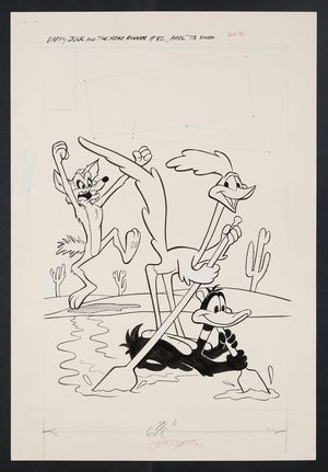 Original Cover Art from Daffy Duck and the Road Runner #82 (1973) from Daffy Duck (1956 Dell/Gold Key) 82 1973 Gold Key Avian solidarity! For the last of the 10 issues of this series to give Road Runner title billing alongside Daffy Duck, the two team up to thwart Wile E. Coyote on this fantastic Looney Tunes cover. Pencil and ink on art board. 13" x 19". |